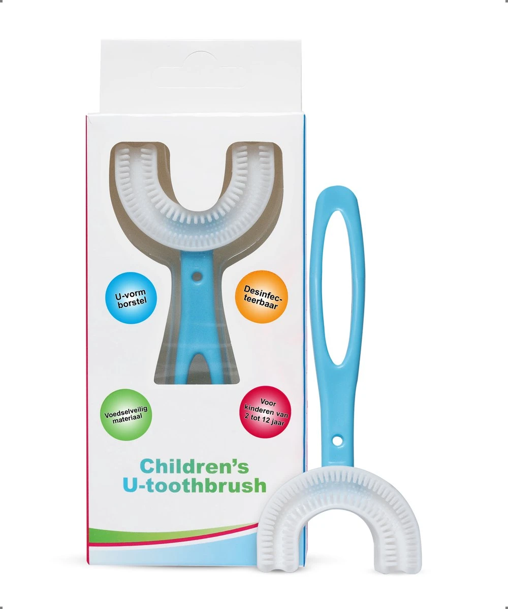 Nous utilisons une brosse unique en forme de U. Ce modèle est plus adapté aux enfants pour se brosser les dents que la brosse à dents traditionnelle. Parce qu’il a une forme en U, il tient facilement dans la bouche de l’enfant, ce qui facilite son acceptation. Et se brosser les dents s’apprend de manière ludique. La tête de brosse allongée assure un bon nettoyage des dents sans que les enfants aient à se tordre le poignet.