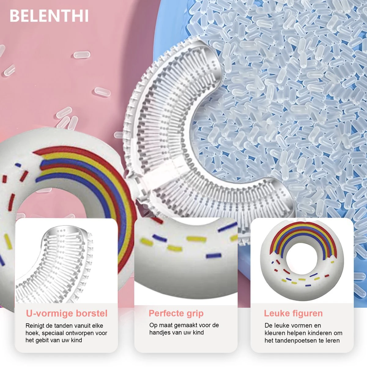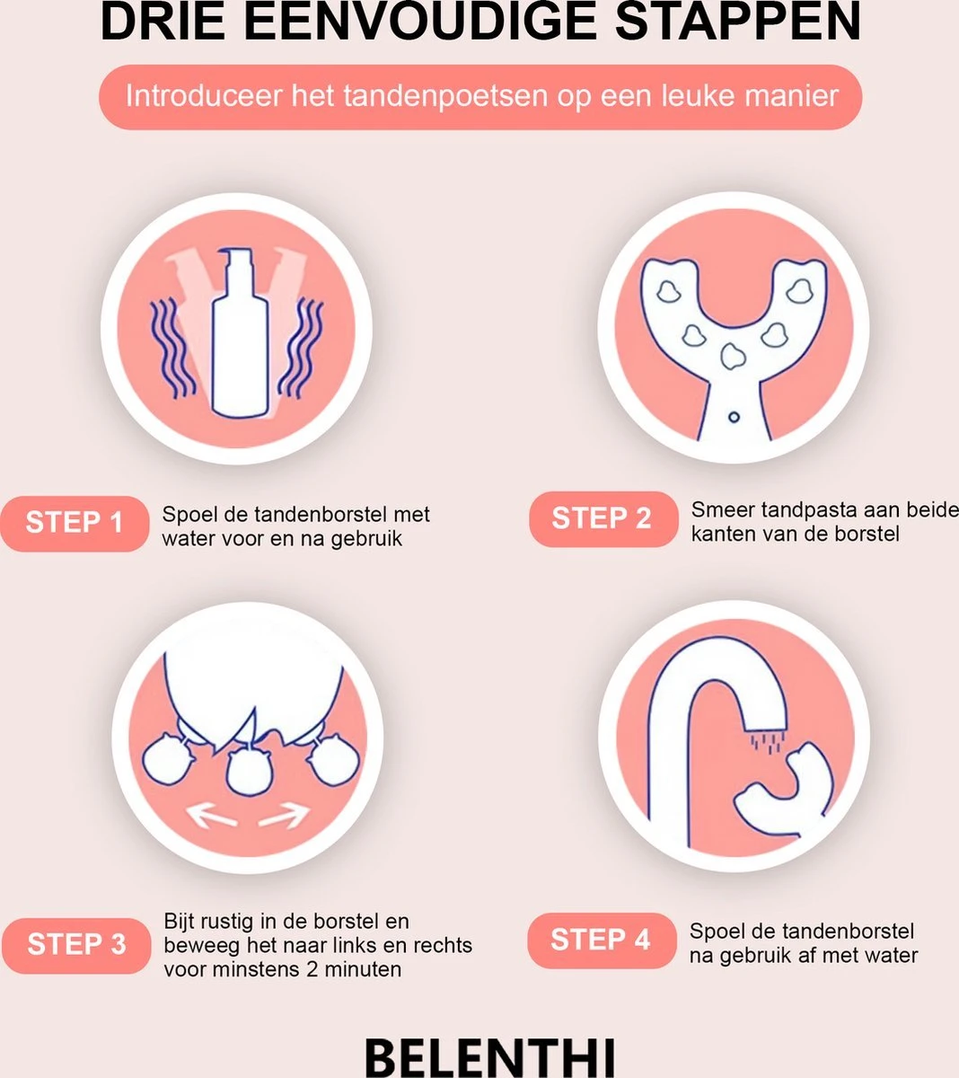 Nous utilisons une brosse unique en forme de U. Ce modèle est plus adapté aux enfants pour se brosser les dents que la brosse à dents traditionnelle. Parce qu’il a une forme en U, il tient facilement dans la bouche de l’enfant, ce qui facilite son acceptation. Et se brosser les dents s’apprend de manière ludique. La tête de brosse allongée assure un bon nettoyage des dents sans que les enfants aient à se tordre le poignet.