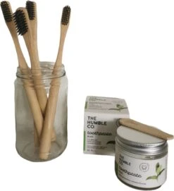 Coffret Familial 4 Brosses à Dents En Bois – Poils Charbon + Dentifrice Menthe – Pour Adultes