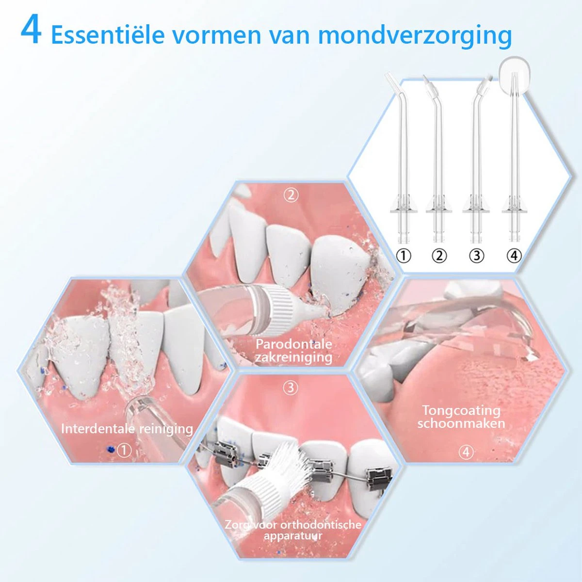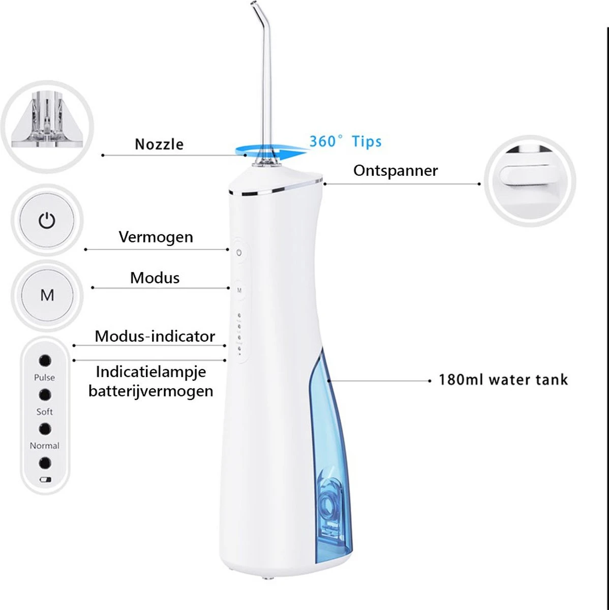 Nettoyage complet : Avec quatre accessoires différents (embout buccal standard, embout orthodontique, nettoyeur de langue et irrigateur de poche pour la parodontite), l’ EWT Water Flosser peut fournir une expérience de nettoyage complète, éliminant efficacement les débris alimentaires et la plaque entre vos dents et le long de la gencive.