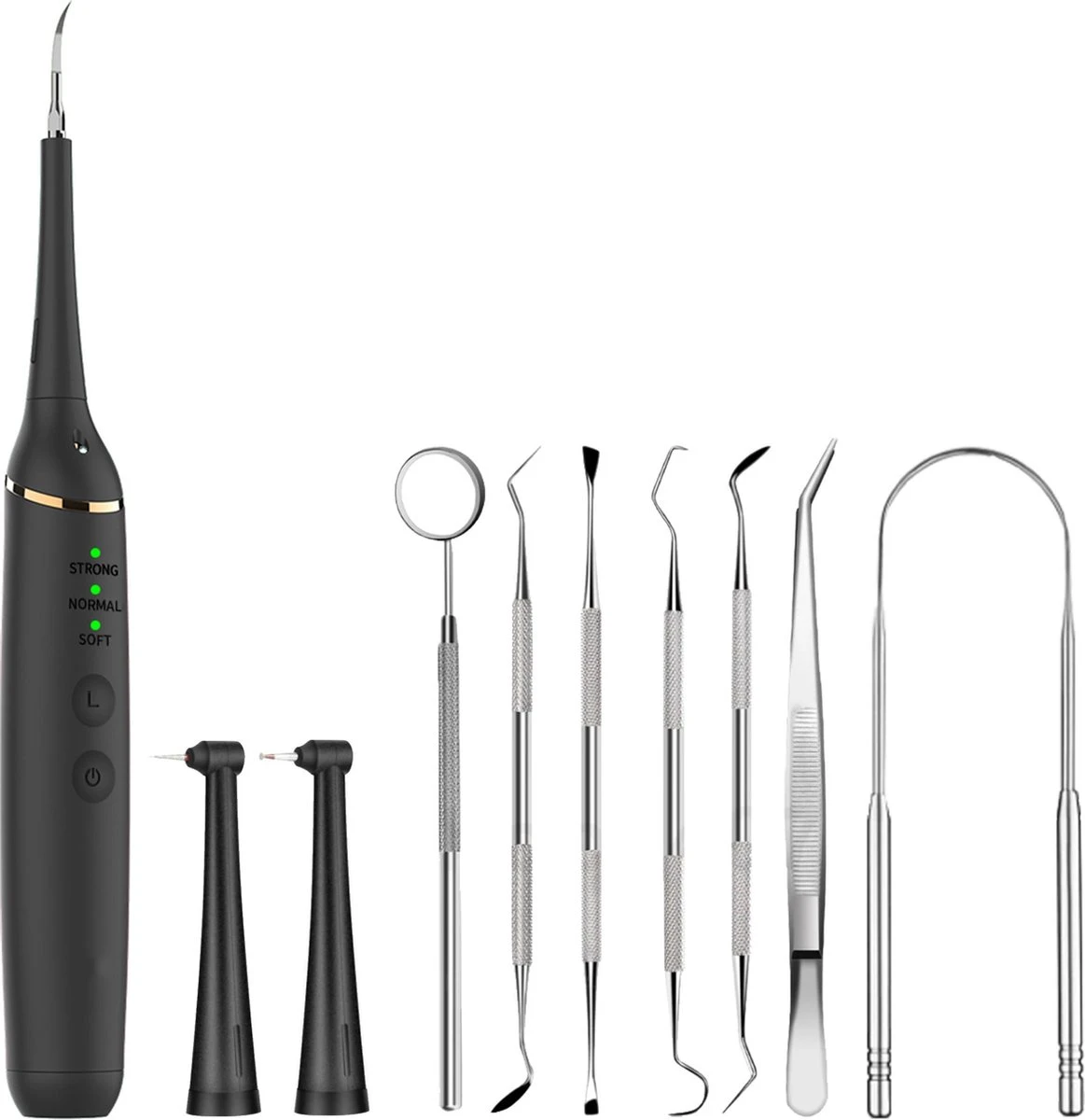 Le dissolvant de tartre Excorn est livré avec 3 accessoires. Le premier est pour entre vos dents. Nous appelons également cela le nettoyeur interdentaire. Ceci est destiné à éliminer les résidus alimentaires et la plaque dentaire. Nous appelons le deuxième accessoire le nettoyeur de surface dentaire. Cela vise à éliminer la différence de couleur de vos dents de devant.