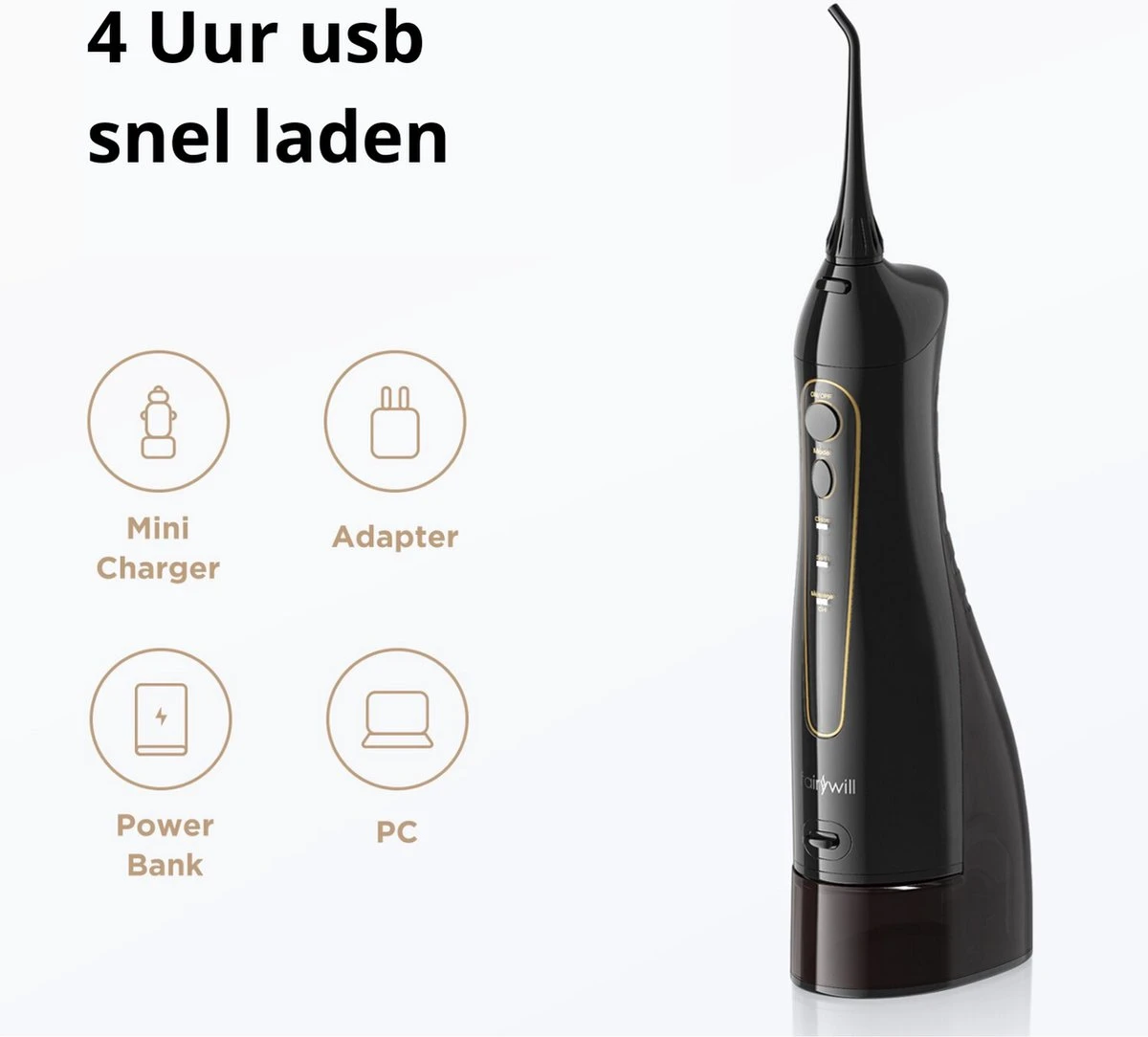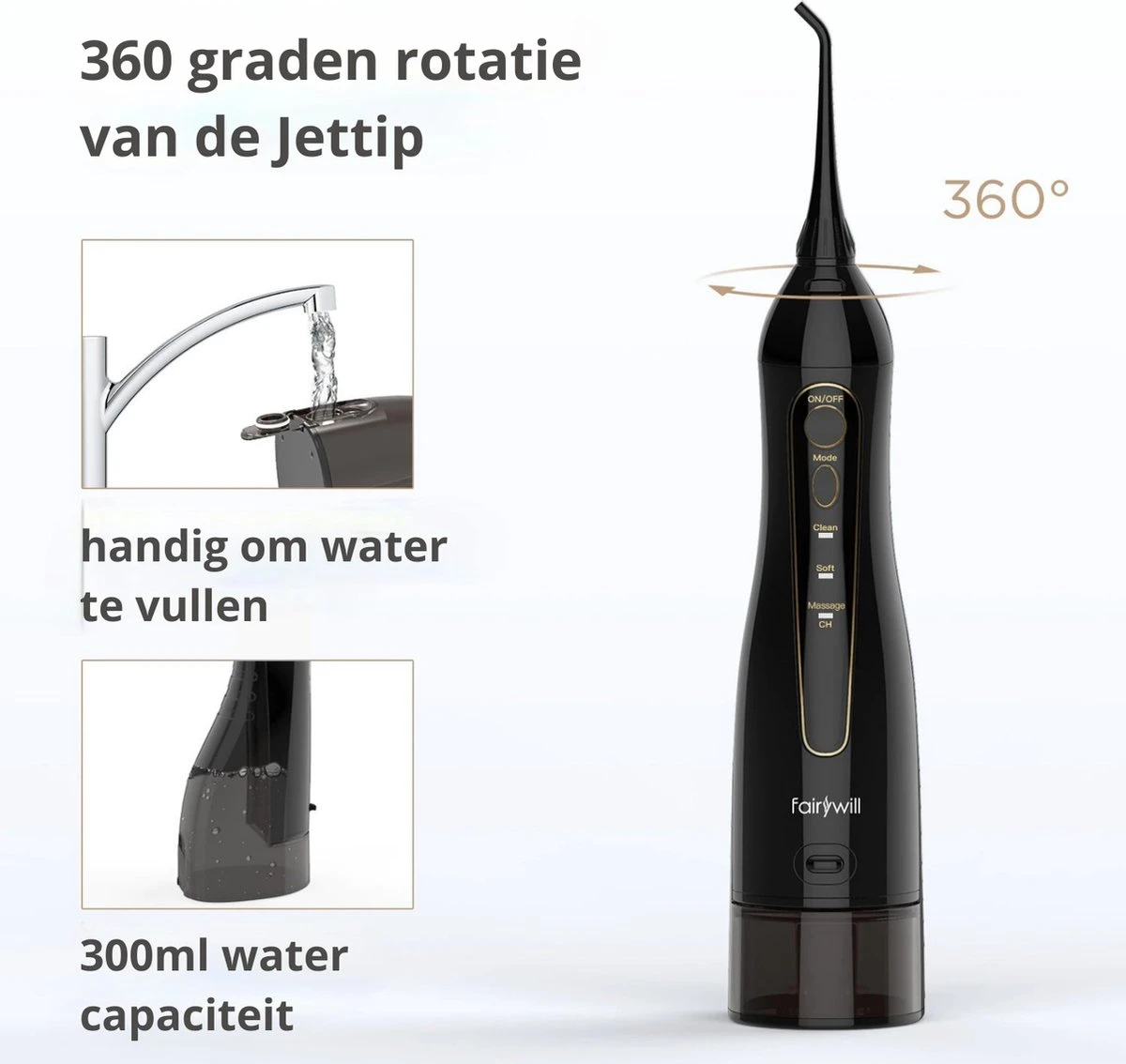 L’irrigateur buccal Fairywill facilite et accélère le nettoyage des espaces interdentaires. Contrairement au fil dentaire, vous pouvez facilement nettoyer les espaces entre vos dents sans forcer les muscles de vos bras. Une solution efficace et rapide pour des gencives plus saines sans compromis sur la qualité. Remplissez l’appareil d’eau, pointez l’embout buccal entre vos dents et éliminez la plaque dentaire en 60 secondes. Le résultat est des gencives plus saines.