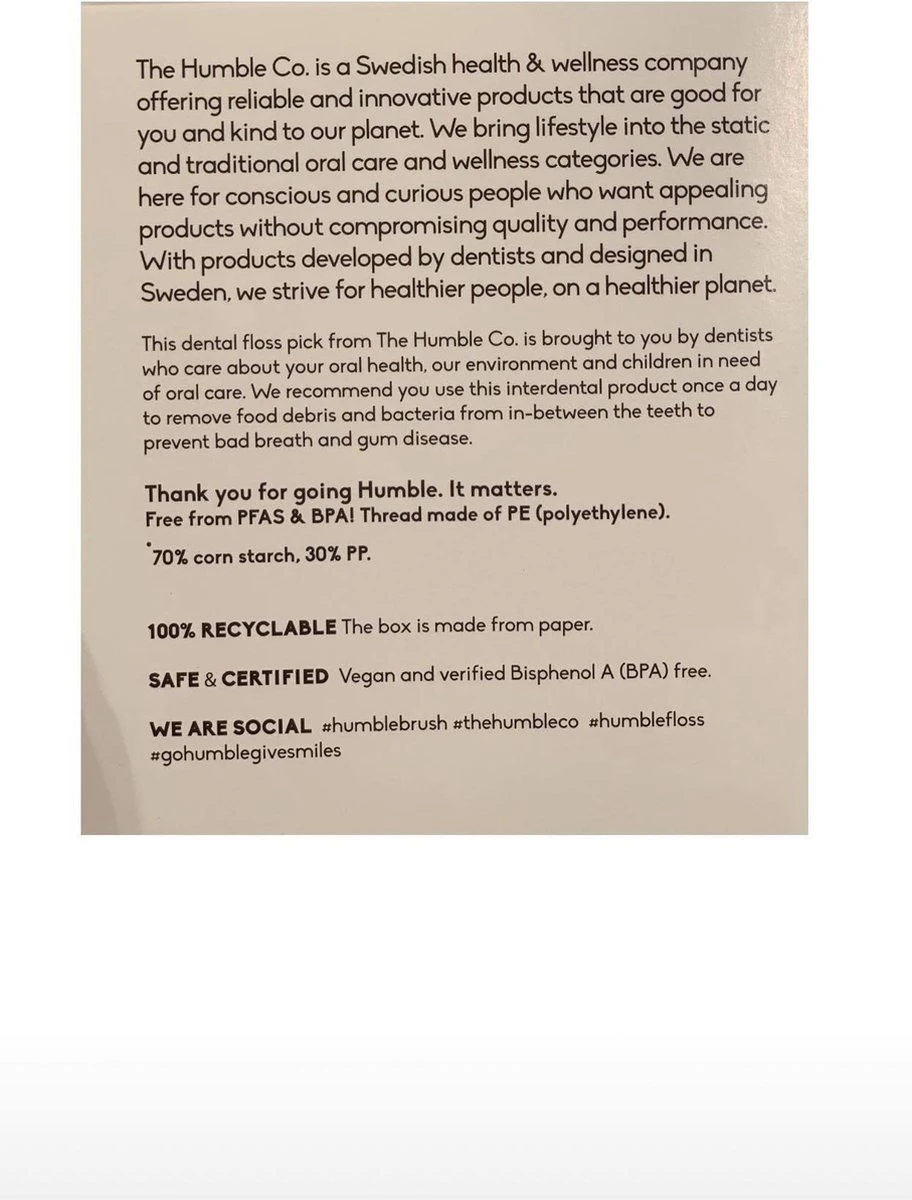 Fil dentaire à double fil (Floss Picks) avec un cure-dent à l’autre extrémité, en bioplastique à base d’amidon de maïs. Le double fil assure une élimination efficace des résidus alimentaires, tandis que la forme du pecker facilite l’accès aux endroits difficiles d’accès.
