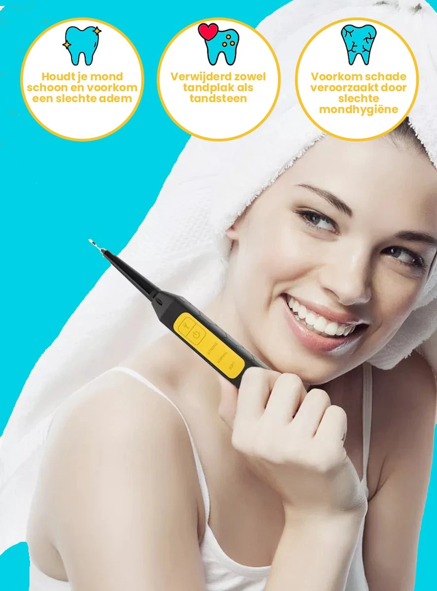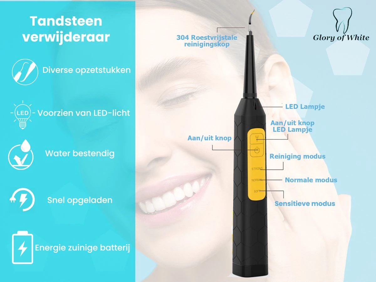 Ce détartrant vous aide à garder vos dents et vos gencives en bonne santé. Appuyez sur le bouton et commencez immédiatement le nettoyage. Le détartrant utilise une technologie de vibration supersonique avec pas moins de 21 000 coups par minute, tout comme l’équipement professionnel de votre dentiste. En utilisant un détartrant, vous pouvez économiser beaucoup de frais chez le dentiste ! De plus, vos dents restent saines tout au long de l’année, ce qui se traduit automatiquement par une meilleure haleine.