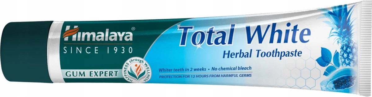 La formule révolutionnaire à base de plantes du dentifrice Himalaya Gum Expert Total White basée sur la technologie des enzymes végétales de papaye et d’ananas élimine en douceur les taches de surface des dents en 2 semaines, blanchissant les dents.