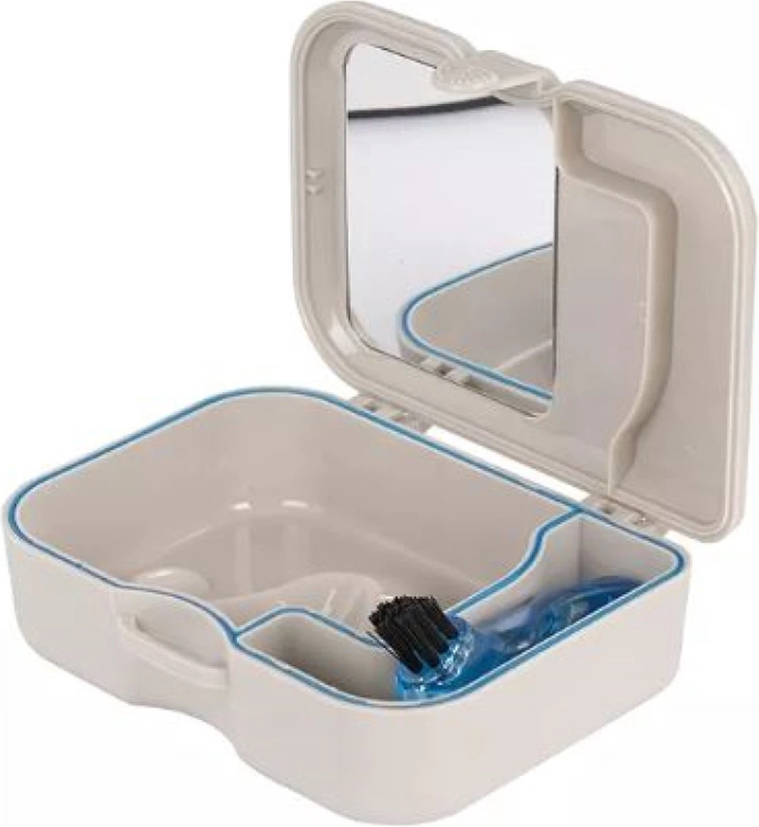 Cette boîte de rangement pratique et robuste est la solution parfaite pour vos dentiers, appareils dentaires ou prothèses. La boîte est équipée d’un grand miroir et d’un compartiment pour la brosse à dentier incluse.