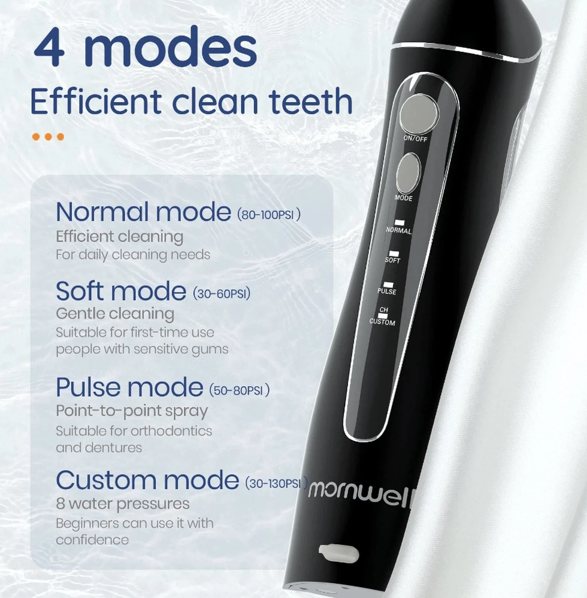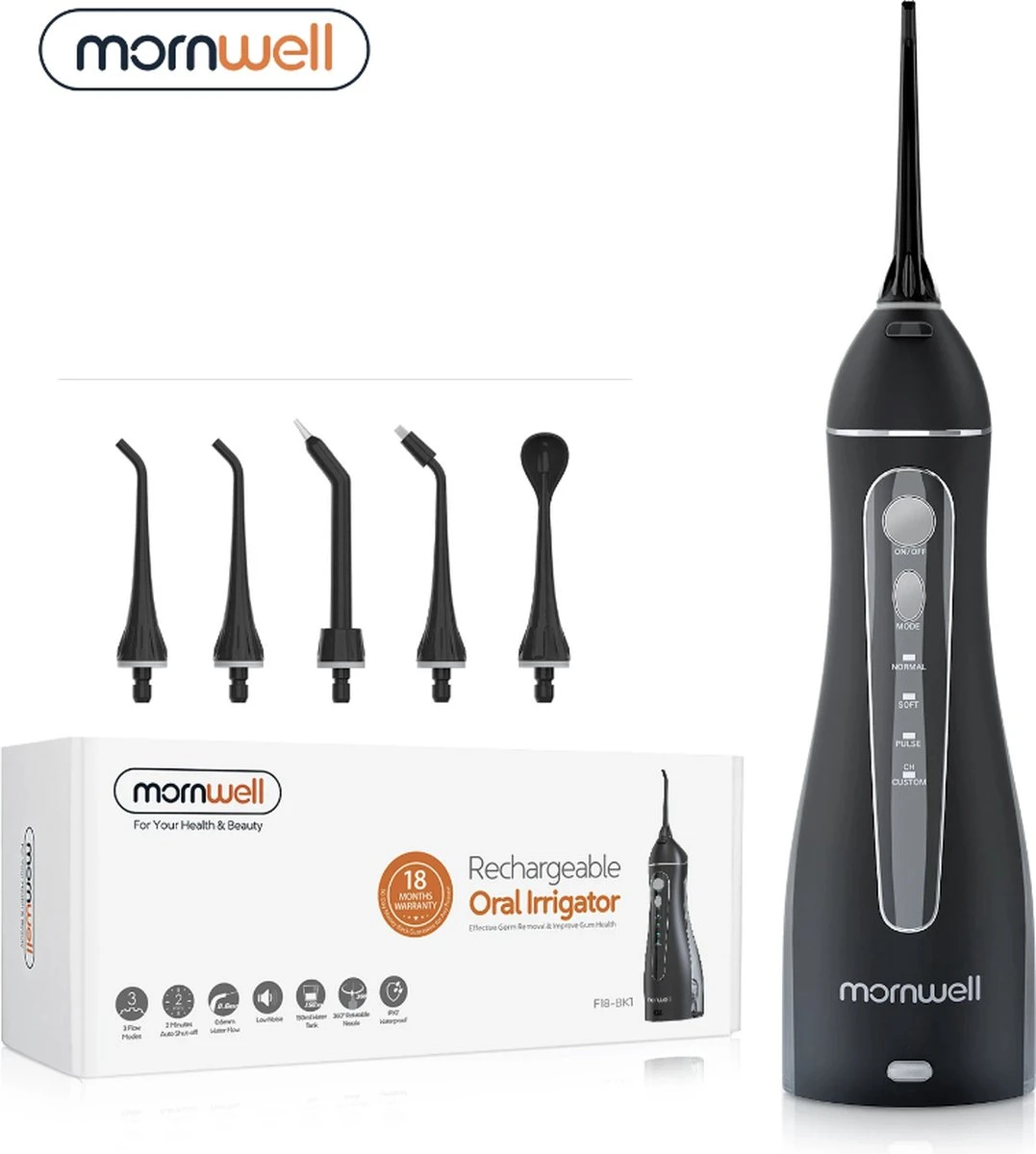 L’hydropulseur Morwell F18 est étanche et équipé de 5 embouts, cet hydropulseur convient à tout le monde, que vous ayez un appareil dentaire ou non. Profitez d’une charge rapide de seulement 8 heures et d’un temps de travail de 15 jours, pour être toujours prêt à améliorer votre santé bucco-dentaire.