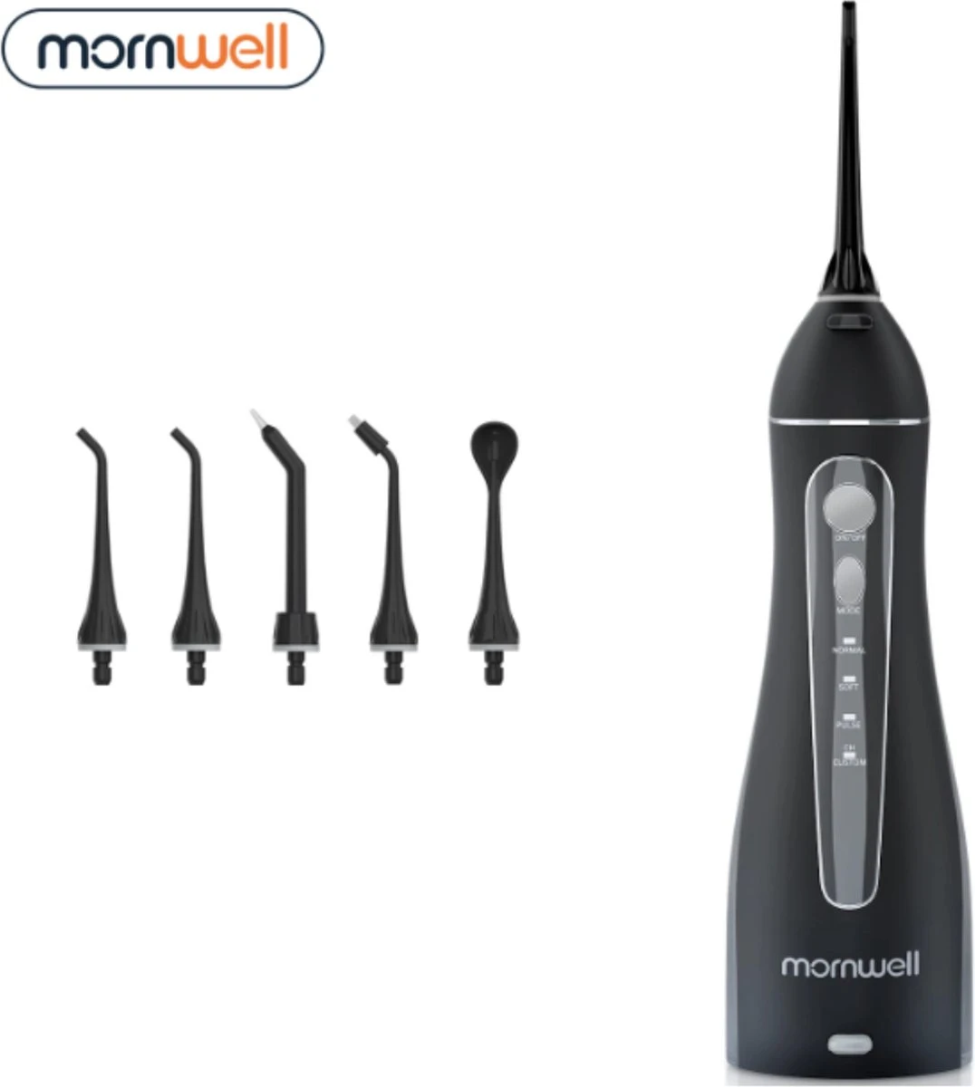 Les embouts buccaux de l’hydropulseur Mornwall peuvent être changés comme avec une brosse à dents électrique. Avez-vous un appareil dentaire ? Utilisez ensuite l’embout orthodontique spécial. Les embouts buccaux peuvent être tournés à 360 degrés afin que vous ayez la garantie d’avoir accès à tout.