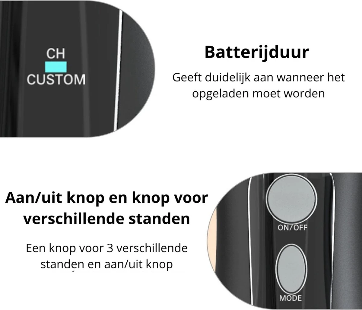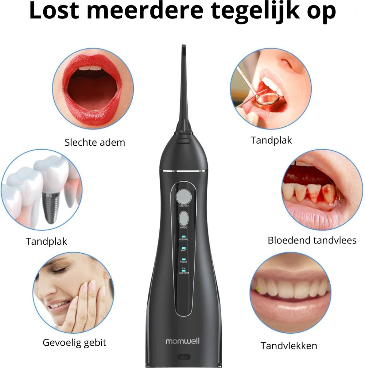 Plus de 75% de la population néerlandaise souffre d’inflammation des gencives. Après tout, le brossage seul ne suffit pas à prévenir les problèmes dentaires. Heureusement, il existe l’ Mornwell sans fil de Mornwell, qui offre une protection puissante pour vos dents ! Massez vos gencives et nettoyez soigneusement vos dents grâce aux quatre modes de nettoyage différents.