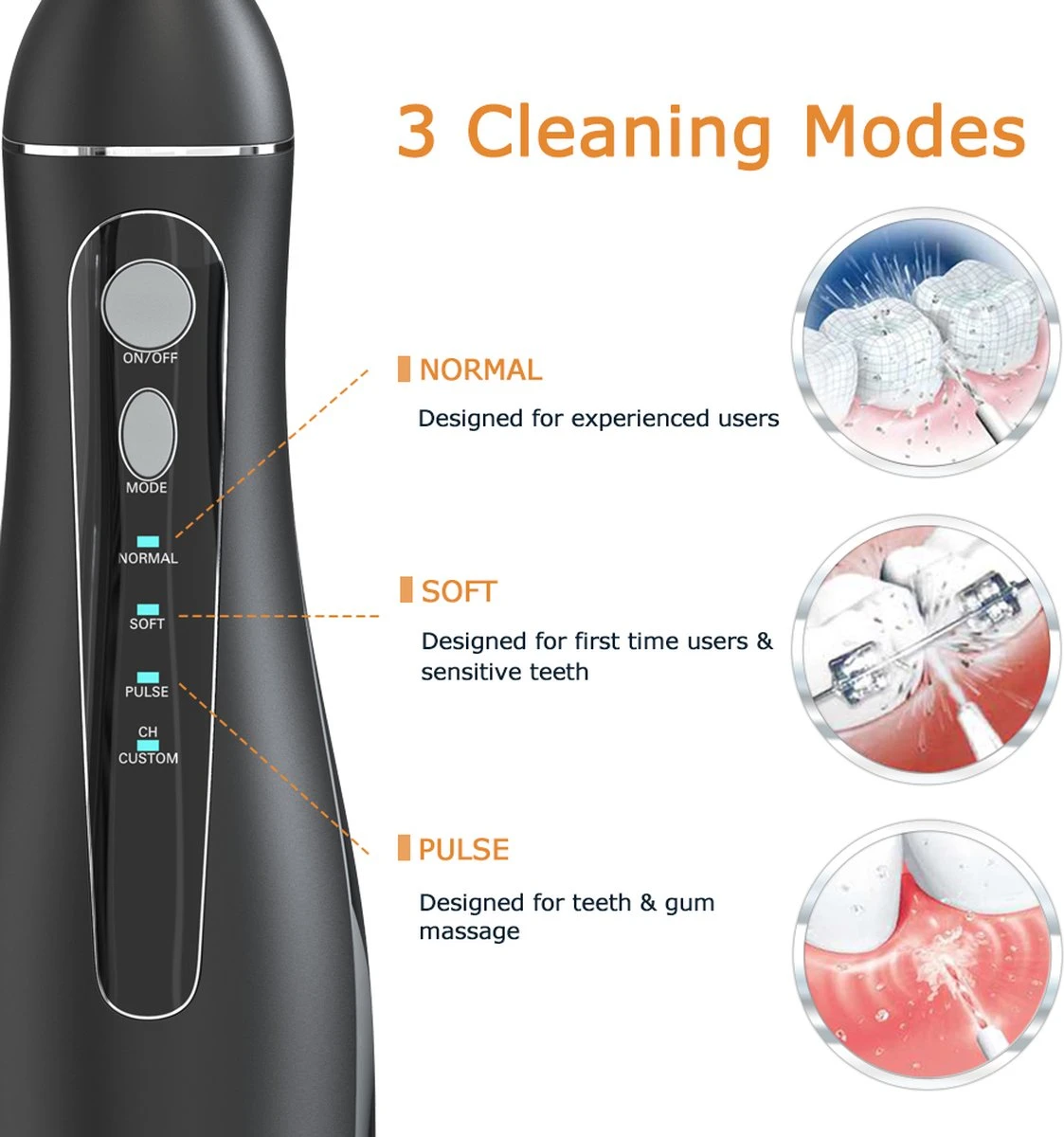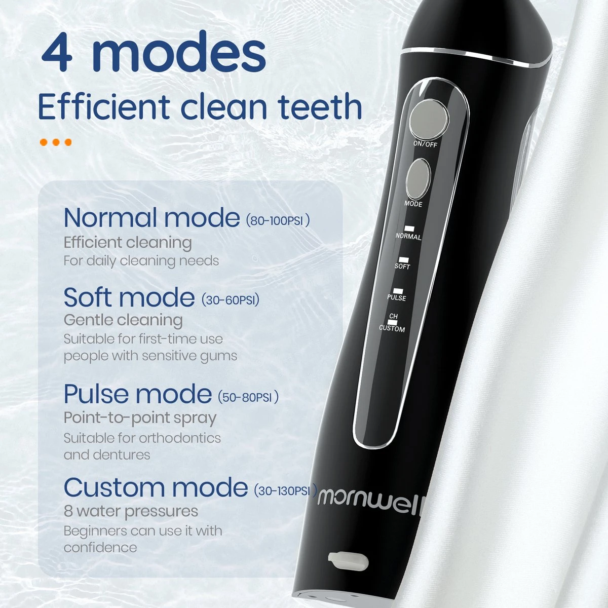 Présentation de l’hydropulseur Mornwell série 1400 , la solution parfaite pour une bouche plus propre et plus saine ! Cet appareil puissant dispose de 4 modes différents pour répondre à tous vos besoins d’hygiène bucco-dentaire :‘Normal’, ‘ soft’, ‘ Pulse’ et ‘Personnalisé’ . Le mode Standard offre un nettoyage puissant pour une utilisation quotidienne, tandis que le mode Soft offre un nettoyage plus doux pour les personnes ayant des gencives sensibles. Le mode Pulse est parfait pour masser vos gencives et améliorer la circulation sanguine.