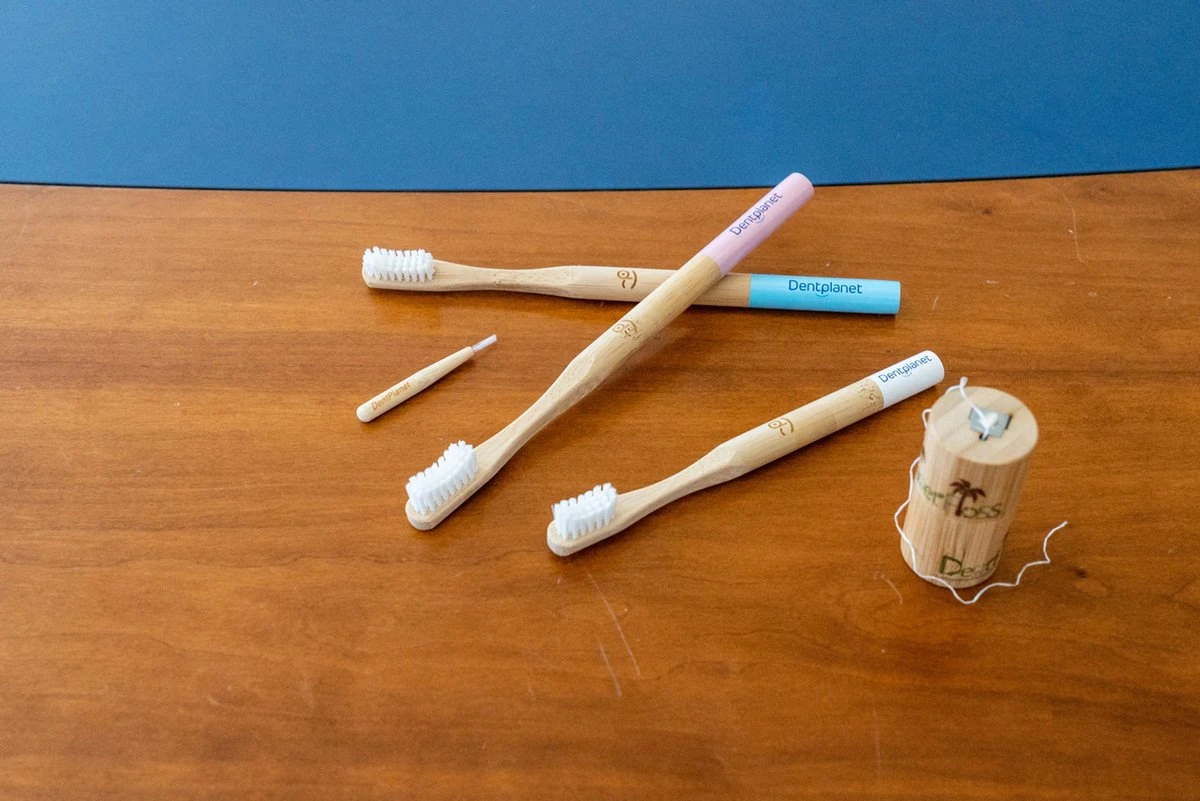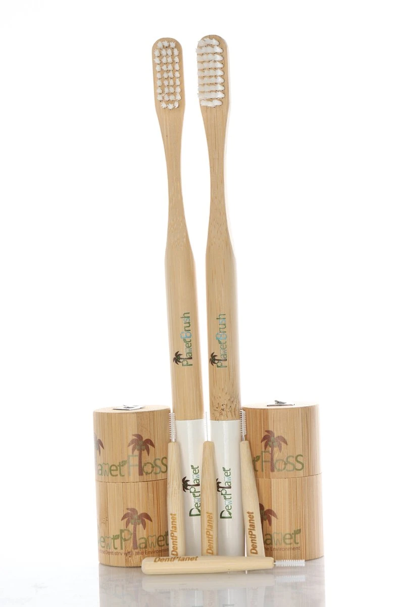 Une collection de 2 brosses à dents (PlanetBrush), 2 fils dentaires (PlanetFloss) et 2 packs de brossettes interdentaires (InterDent) (tout en bambou)