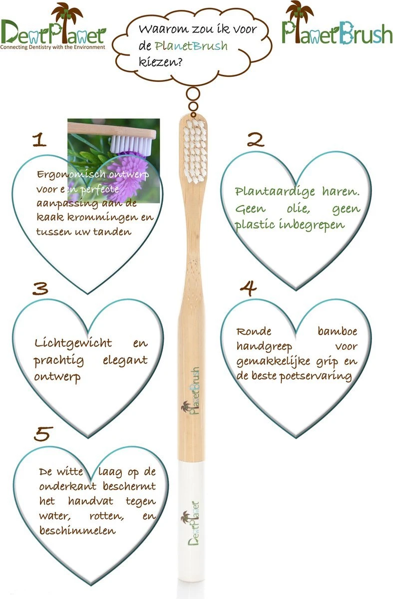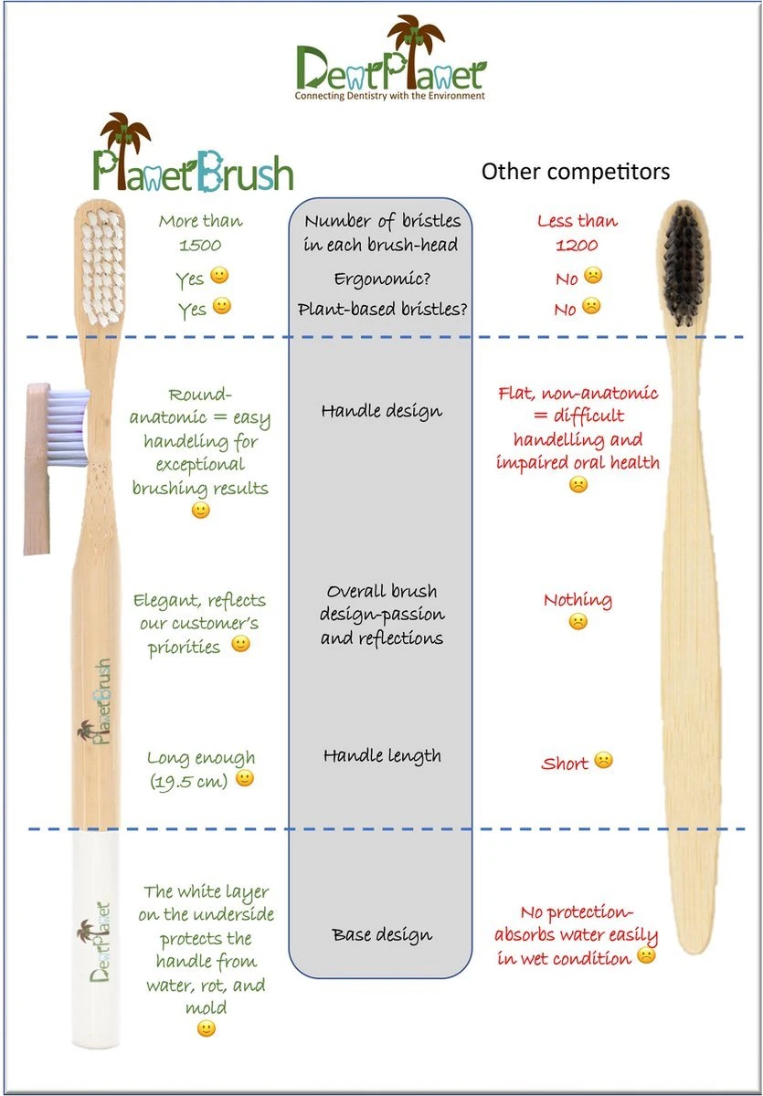 La nouvelle brosse à dents de DentPlanet. PlanetBrush est une élégante brosse à dents écologique entièrement fabriquée à partir de bambou de la plus haute qualité et, plus important encore, avec des poils à base de plantes (huile de ricin). Les poils ont un design ergonomique qui offre le meilleur nettoyage anatomique des dents. Le manche de la brosse est un manche agréablement arrondi pour une prise en main facile et un brossage en douceur pour toutes les zones antérieures et postérieures de la mâchoire.