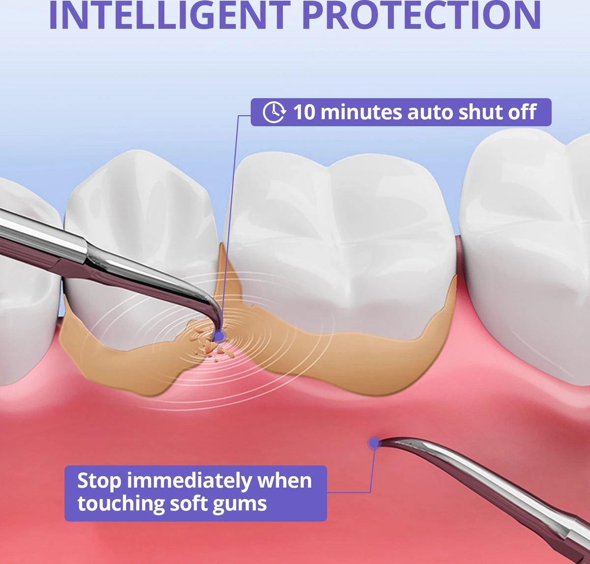 - Sûr et indolore : le détartrant ne démarre que lorsque la tête de nettoyage touche vos dents ou des objets durs, il s’arrête automatiquement de vibrer lorsqu’il touche des gencives molles, ce qui est totalement sans danger pour vos gencives, matériau ABS de qualité alimentaire et acier inoxydable de qualité médicale, plus confortable et plus facile à nettoyer. (Remarque : Nous vous conseillons de commencer par le mode le plus doux afin de ne pas laisser la tête de nettoyage au même endroit plus de 2 secondes et de ne pas lui appliquer de forte pression).
