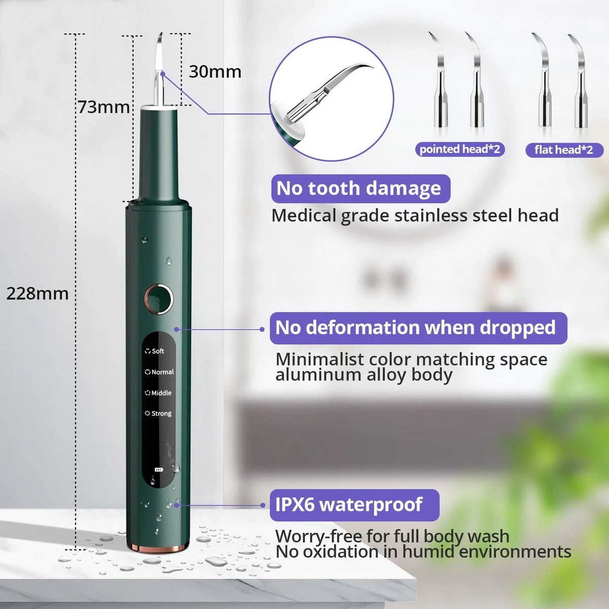 - Geen de vibration et faible bruit : notre dissolvant de plaque dentaire pour les dents adopte une technologie de vibration à haute fréquence (vibration de fréquence 42 KHz pour la pointe) qui peut facilement séparer la plaque et le tartre, ce dissolvant de tartre n’a pas de vibration et très peu de bruit pendant l’utilisation.