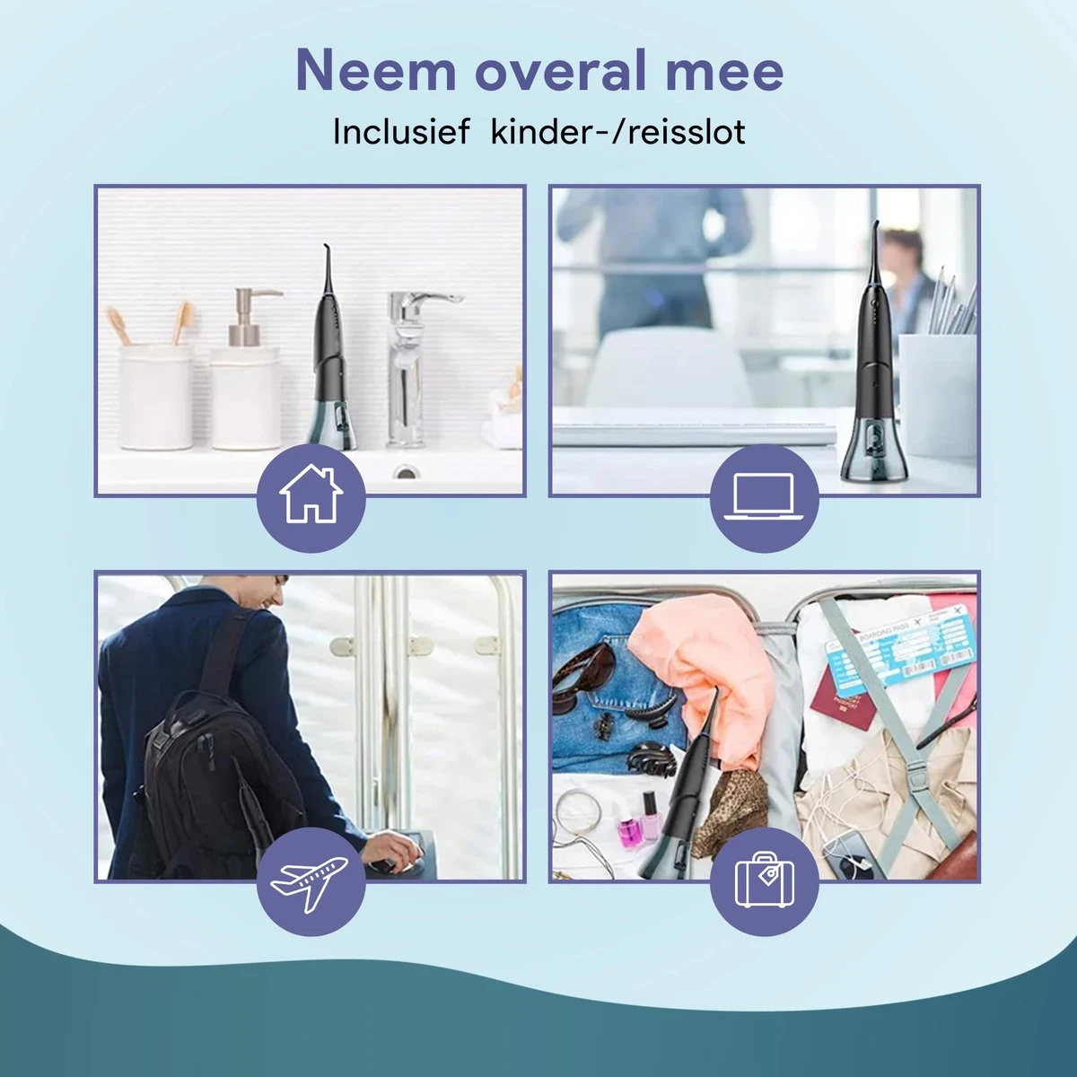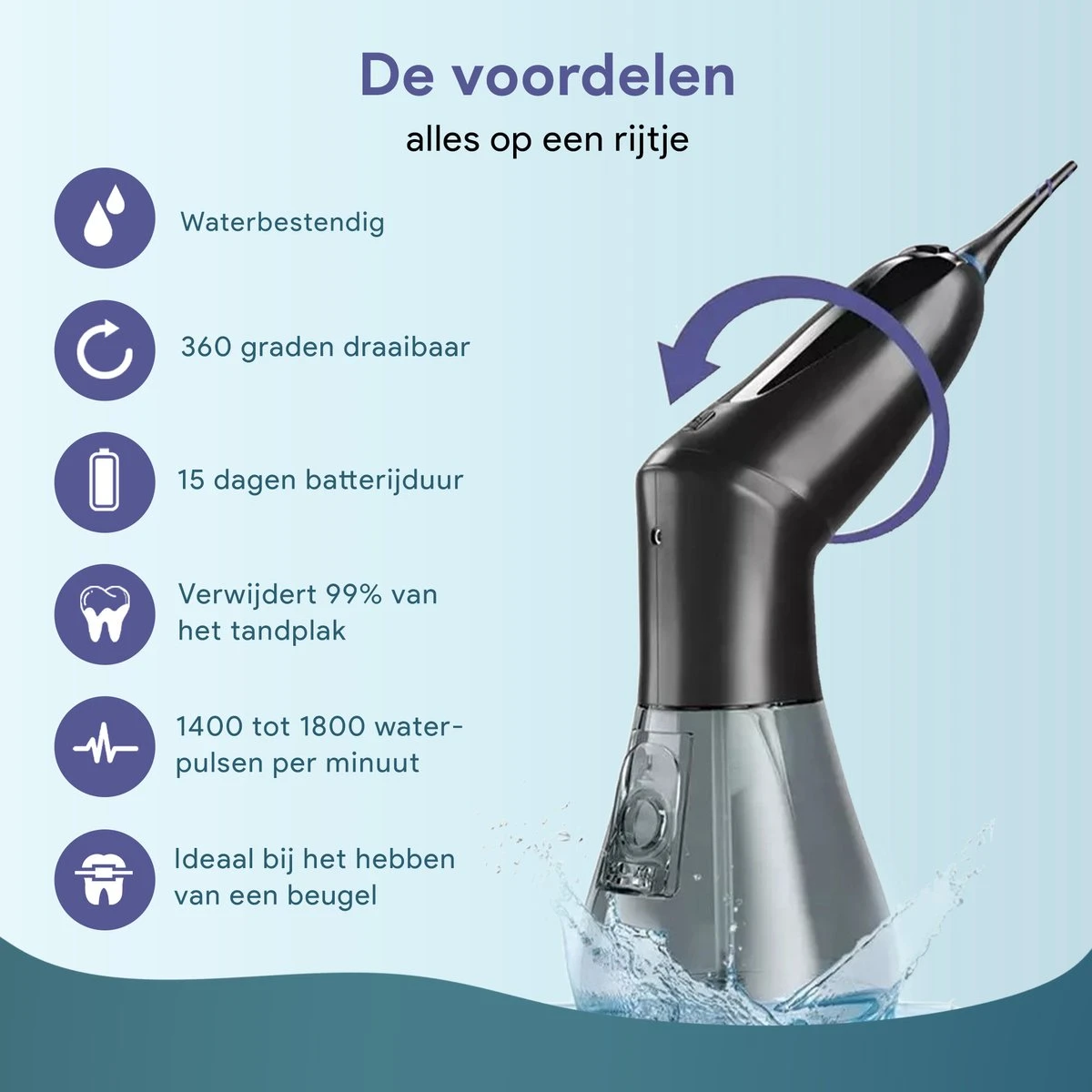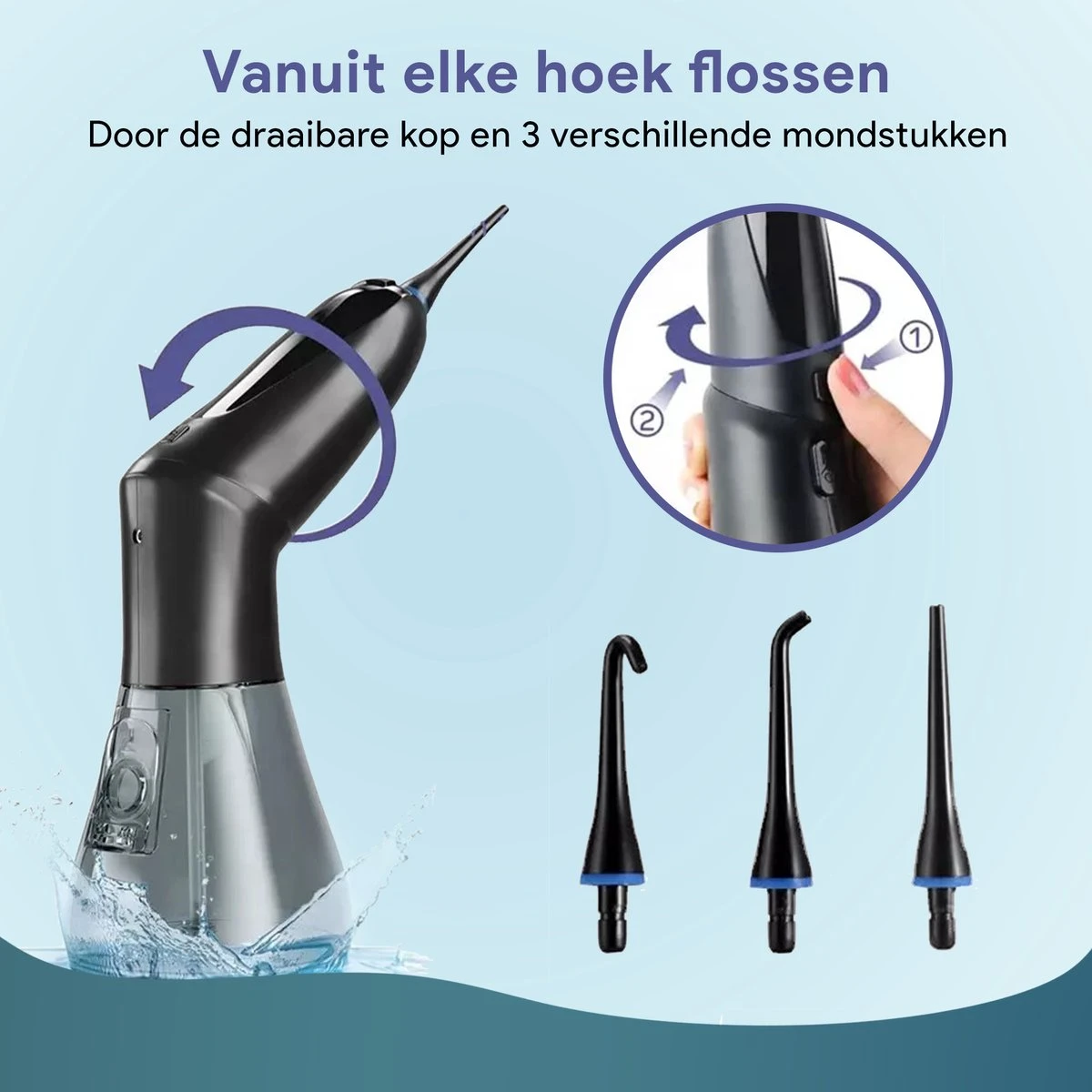 Intégrez cet hydropulseur à vos soins quotidiens et assurez-vous des dents éclatantes ! Et cela en seulement 1 minute par jour. Maintenant, prenez également soin de vos dents aux endroits où votre brosse à dents manque. Avec les 3 accessoires inclus, vous pouvez être sûr que vous pouvez tout atteindre !