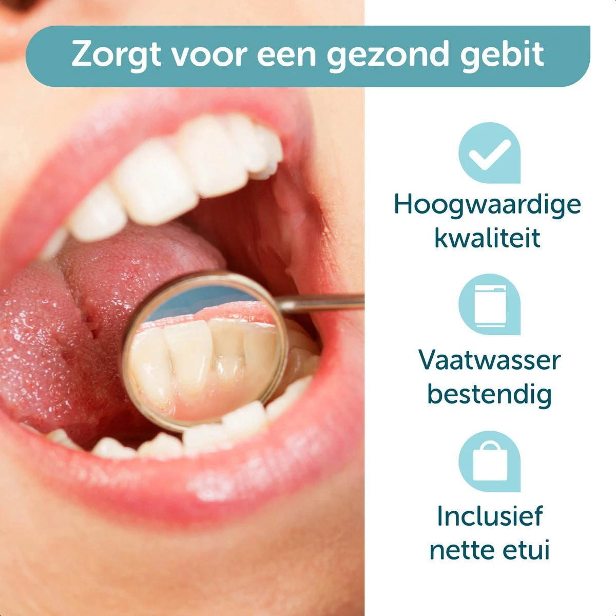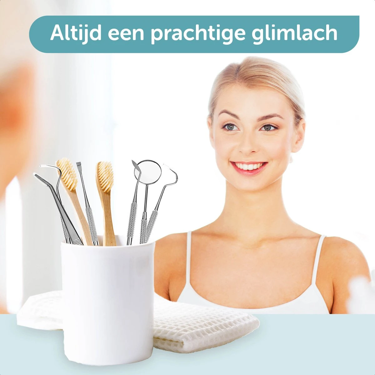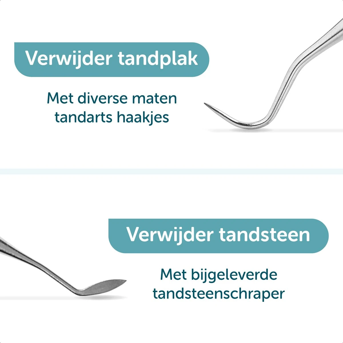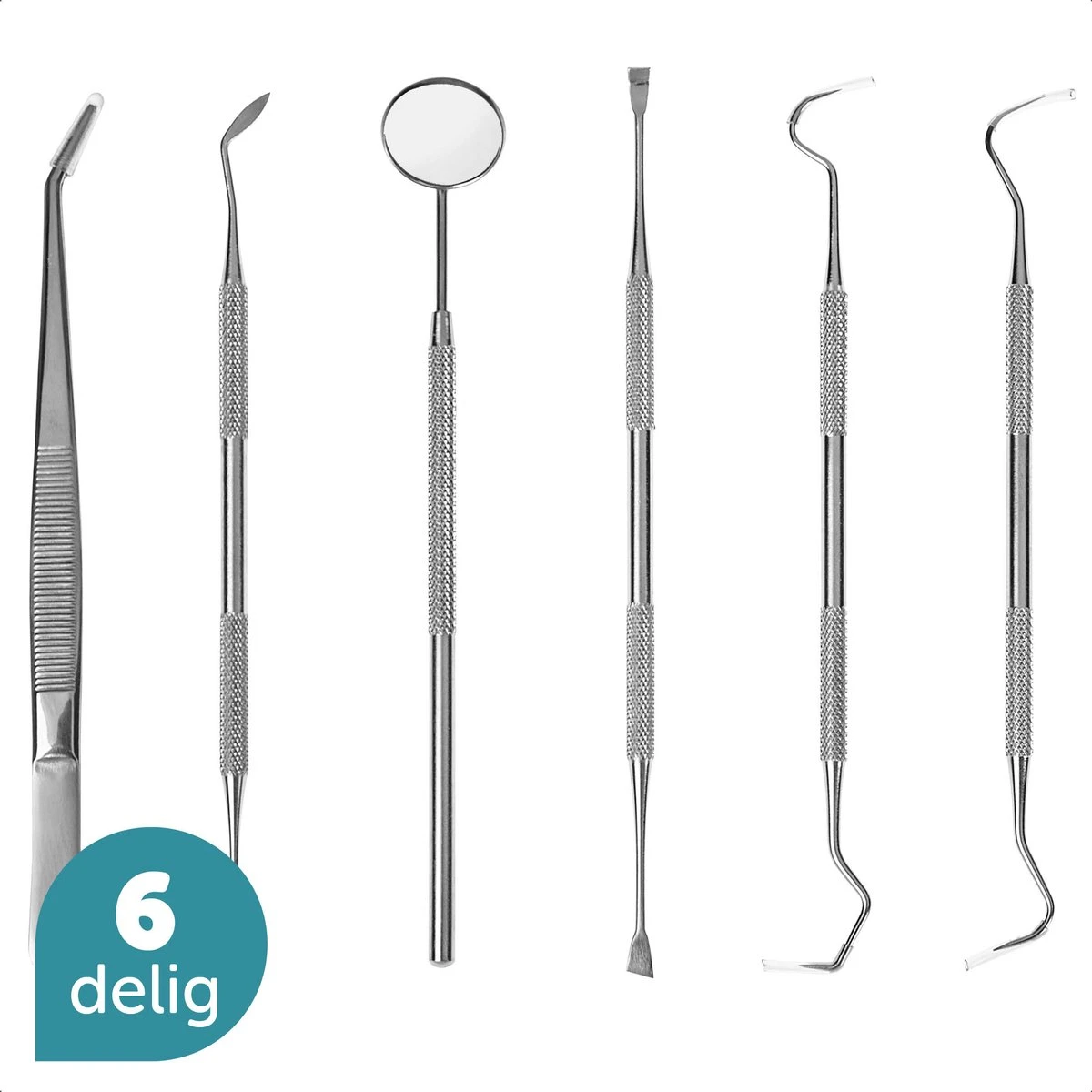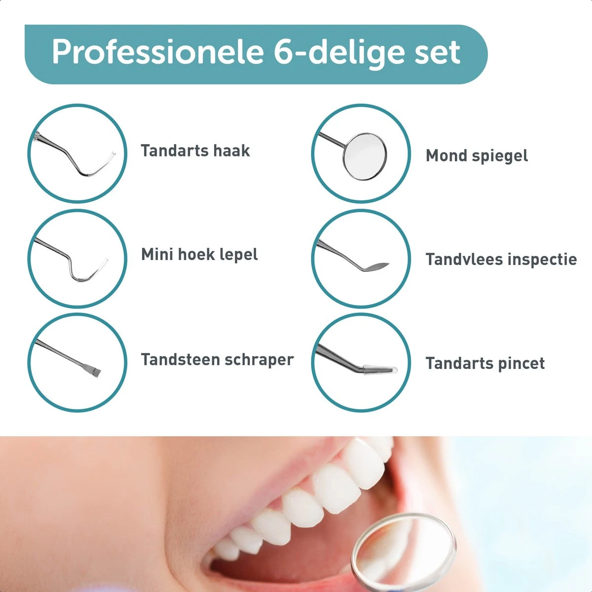 4 x crochet dentaire pour l’élimination du tartre, 1 x miroir buccal, 1 x pince à épiler, 1 x pochette de rangement