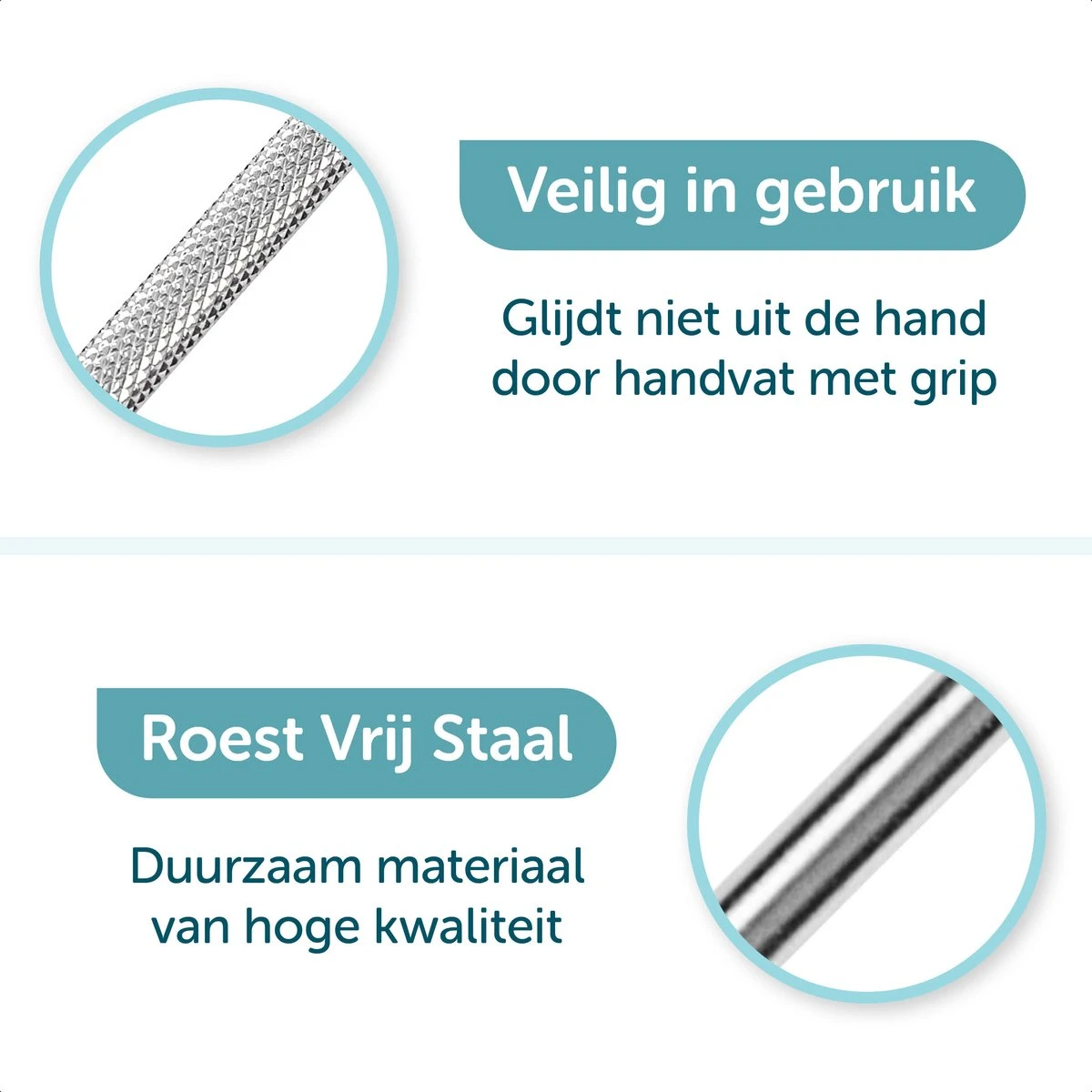 L’ensemble est fait d’acier inoxydable de haute qualité et est donc durable et facile à nettoyer. Cet ensemble va également au lave-vaisselle et ne rouille pas. Remarque: nous vous recommandons de désinfecter l’ensemble avec de l’alcool après chaque utilisation.
