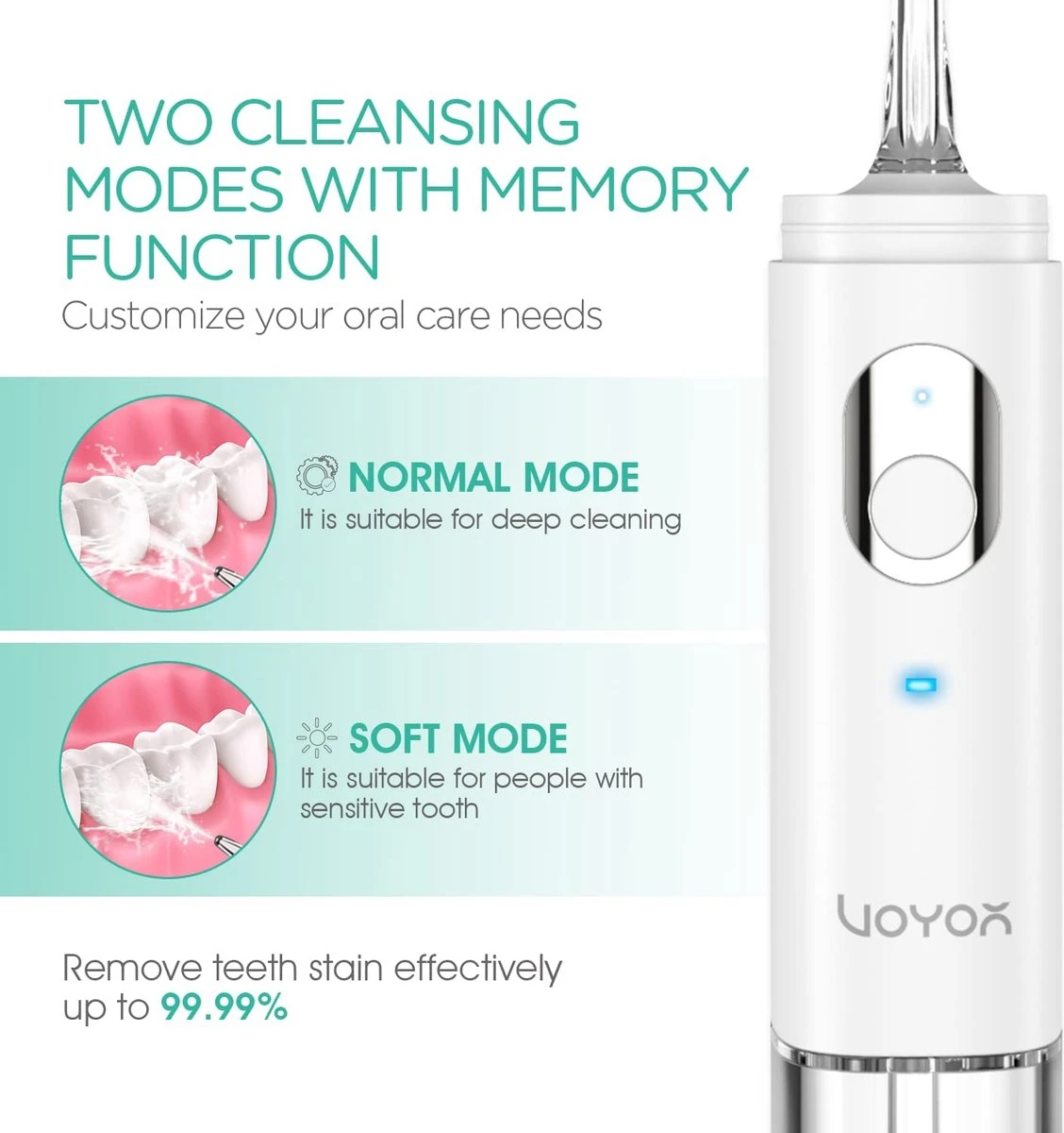 - Fonction mémoire et minuterie automatique – Livré avec un mode normal et doux, pour un nettoyage en profondeur et un nettoyage quotidien, la fonction de mémoire de mode le rend pratique à chaque fois que vous l’utilisez. Le nettoyeur de dents s’éteint automatiquement après 1 minute de travail pour protéger vos gencives.