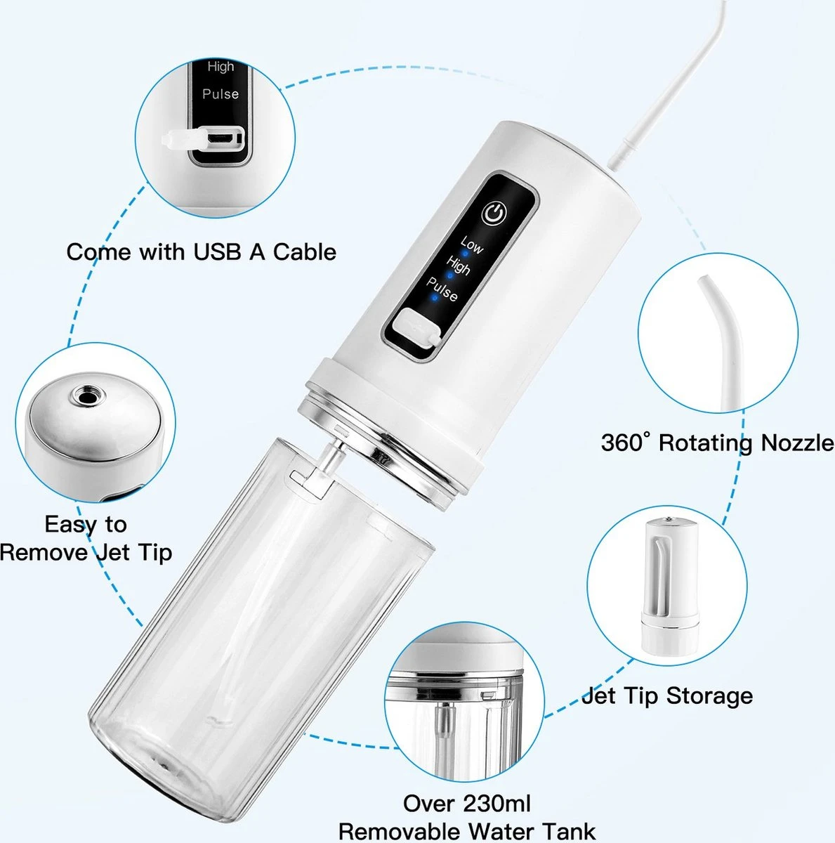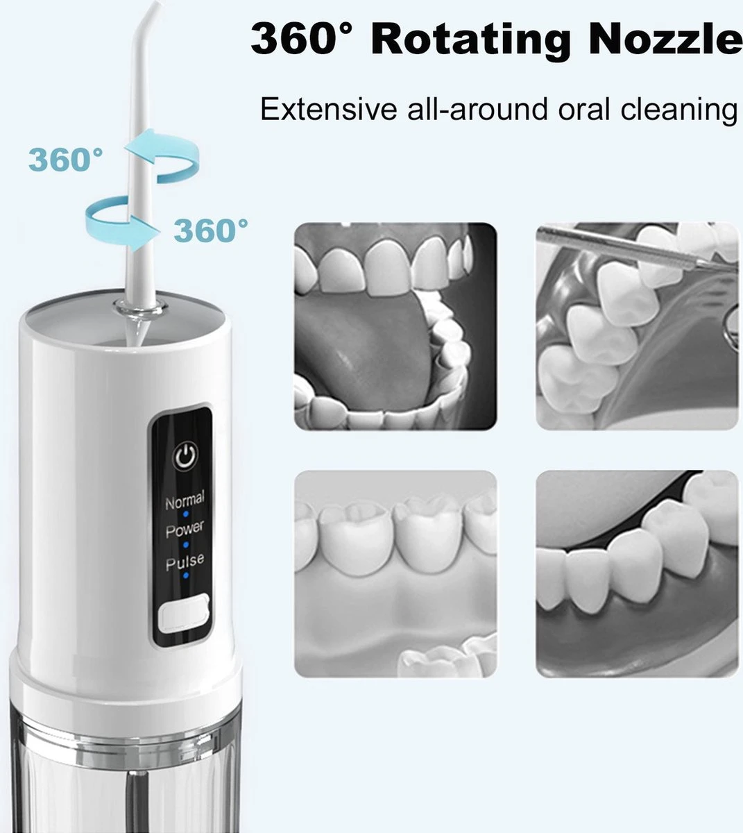 Le nettoyeur de dents de voyage dispose de 3 modes de fil dentaire (mode doux, pulsé et fort), y compris 4 embouts de jet interchangeables pour vos différents besoins de nettoyage de la bouche. Les embouts de Jet peuvent pivoter à 360 degrés pendant l’utilisation, pour répondre à vos différents besoins, du nettoyage de base au massage des gencives, adapté à la maison, au bureau, en voyage d’affaires ou en voyage.