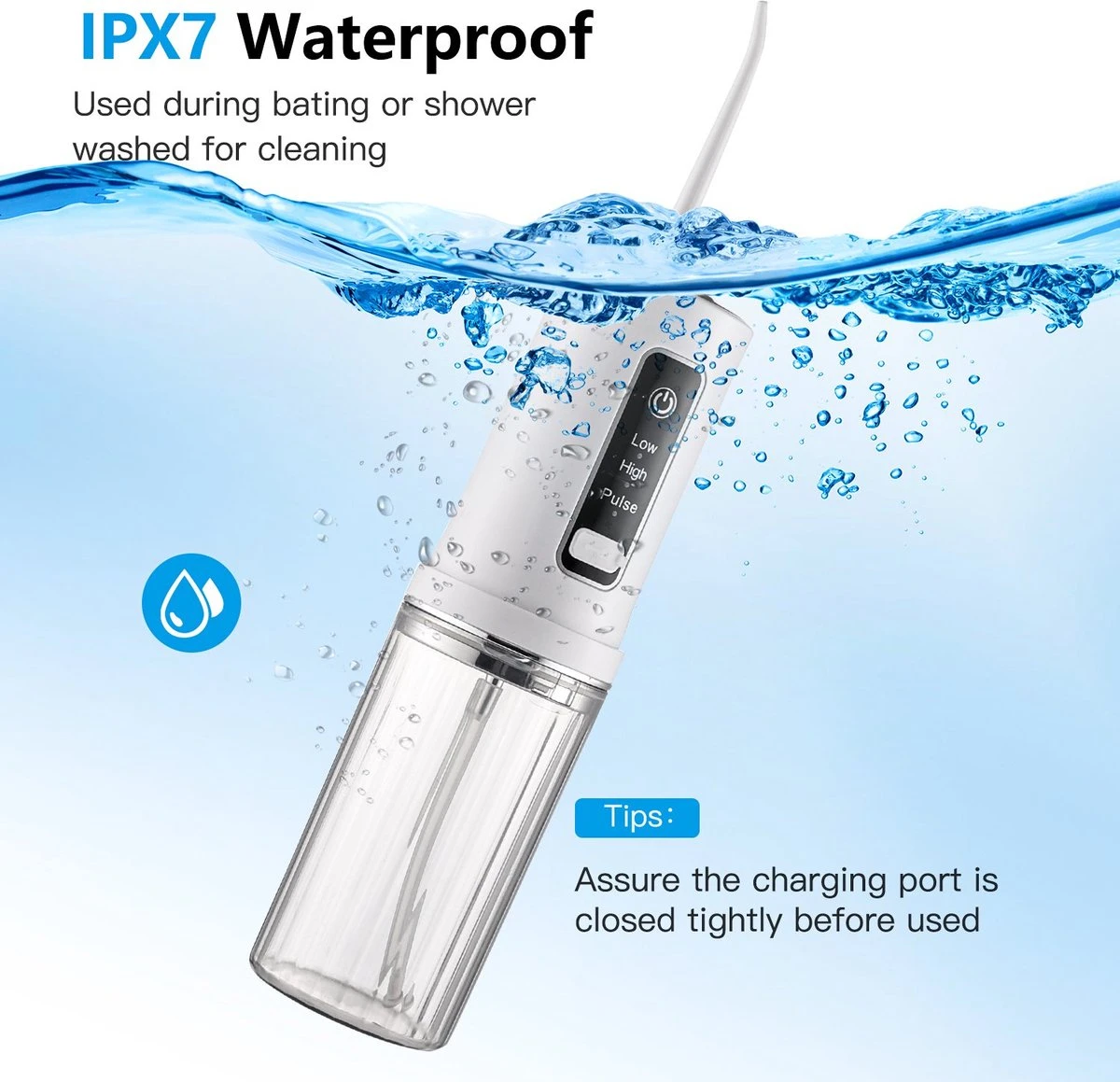 Le nettoyage des dents de l’irrigateur buccal dentaire est adopté avec une conception étanche IPX7, une utilisation sûre pour la douche dans la salle de bain. Avec le réservoir d’eau entièrement ouvert amovible de 230 ml, il est plus facile de remplir l’eau et de nettoyer la coque interne plus en profondeur.