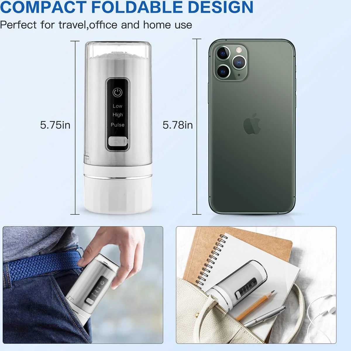 L’hydropulseur portable est pliable et la taille pliée est similaire à un smartphone et facile à mettre dans des sacs et des bagages. Sans fil et léger, idéal pour une utilisation à la maison, au bureau, au gymnase ou en voyage.